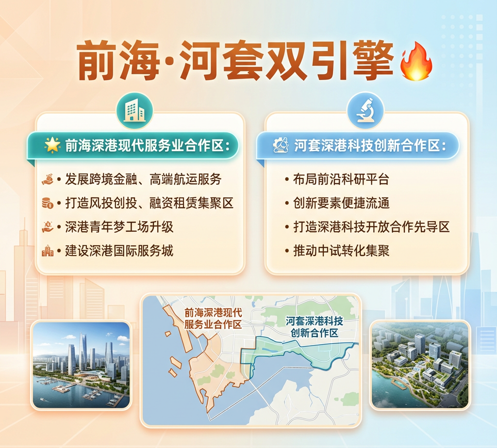 全面深化前海深港现代服务业合作区改革开放,实施前海全球服务商计划,大力发展跨境金融、大宗商品现货交易、信息服务、高端航运服务、法律、会计、咨询等产业,打造风投创投、融资租赁、跨境电商等集聚区,大力推动灵活多样的深港合作,推动深港现代服务业同珠三角先进制造业深度融合,打造面向全国全球重要的生产性服务业中心,深入开展深港青年梦工场提升行动,加快推进深港国际服务城等重点项目建设,优化完善行政区和经济区适度分离下的管理体制,以前海开发开放助力香港服务业拓展发展空间、服务构建全国统一大市场、推进面向世界的交流合作,打造全面深化改革创新试验平台、高水平对外开放门户枢纽、深港深度融合发展引领区、现代服务业高质量发展高地。高质量、高标准、高水平推进河套深港科技创新合作区深圳园区建设,紧密对接香港园区发展纲要,建立联合建设、共享成果的合作推进机制,探索自由便捷的科研人员、物资、装备特别是先进装备等创新要素进出查验监管模式,布局一批枢纽型、链接型、全球化前沿科研平台,创新口岸通关查验方式,加快推出一批技术创新和产业创新成果,打造深港科技创新开放合作先导区、国际先进科技创新规则试验区、粤港澳大湾区中试转化集聚区。高水平建设广东自贸试验区前海蛇口片区,推动货物贸易创新发展、服务贸易自由便利,加快构建以投资贸易自由化便利化为核心的制度体系,打造开放型经济新体制先行区、粤港澳大湾区合作示范区。积极对接香港北部都会区发展策略,以点带面提升合作水平。强化与横琴、南沙等重大合作平台改革联动、创新联动、产业联动,共同提升平台枢纽功能、通道优势、链接作用。