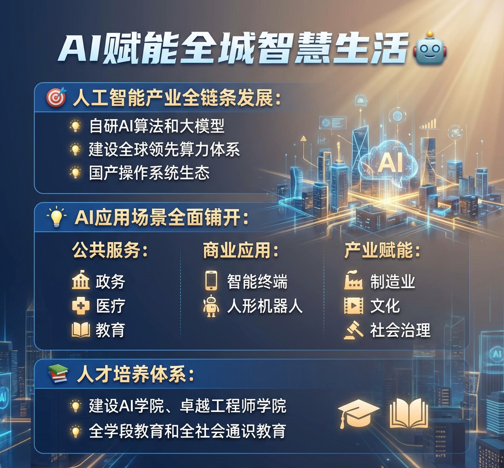 (10)推进人工智能产业高质量发展和全域全时高水平应用。充分发挥机电一体化和软硬件协同优势,加快速度做强产业全链条,发展壮大国产操作系统生态,推动人工智能计算芯片和软件生态自主可控。深入开展算力强基行动,构建全球领先通用算力、智能算力、超级算力一体的基础设施体系。支持企业自研新型人工智能算法,加快人工智能通用大模型和垂类大模型研发应用。强化公共数据开放和行业数据使用,建设涵盖面广、内容丰富、标准统一的数据语料集。加大数、算、电、网、用等资源协同,加快推动超智融合发展,统筹算力资源跨平台、跨层级、跨区域使用。全面落实“人工智能+”行动,加大力度拓展应用和产业空间,在公共服务领域充分挖掘所有可能的应用场景,在商业应用领域加大协调支持力度,加强人工智能同产业发展、文化建设、民生保障、社会治理相结合,抢占人工智能产业应用制高点,支持人工智能进入千家万户、深度赋能千行百业。推动具身智能规模化应用,支持人形机器人、脑机接口等行业发展,加快培育新型智能终端集群。推动人工智能引领科研范式变革,加速各领域科技创新突破。最大决心加快形成强大的企业和人才支撑,建设好人工智能学院、卓越工程师学院,推进人工智能全学段教育和全社会通识教育。加强人工智能治理,完善相关法规、政策制度、应用规范、伦理准则。