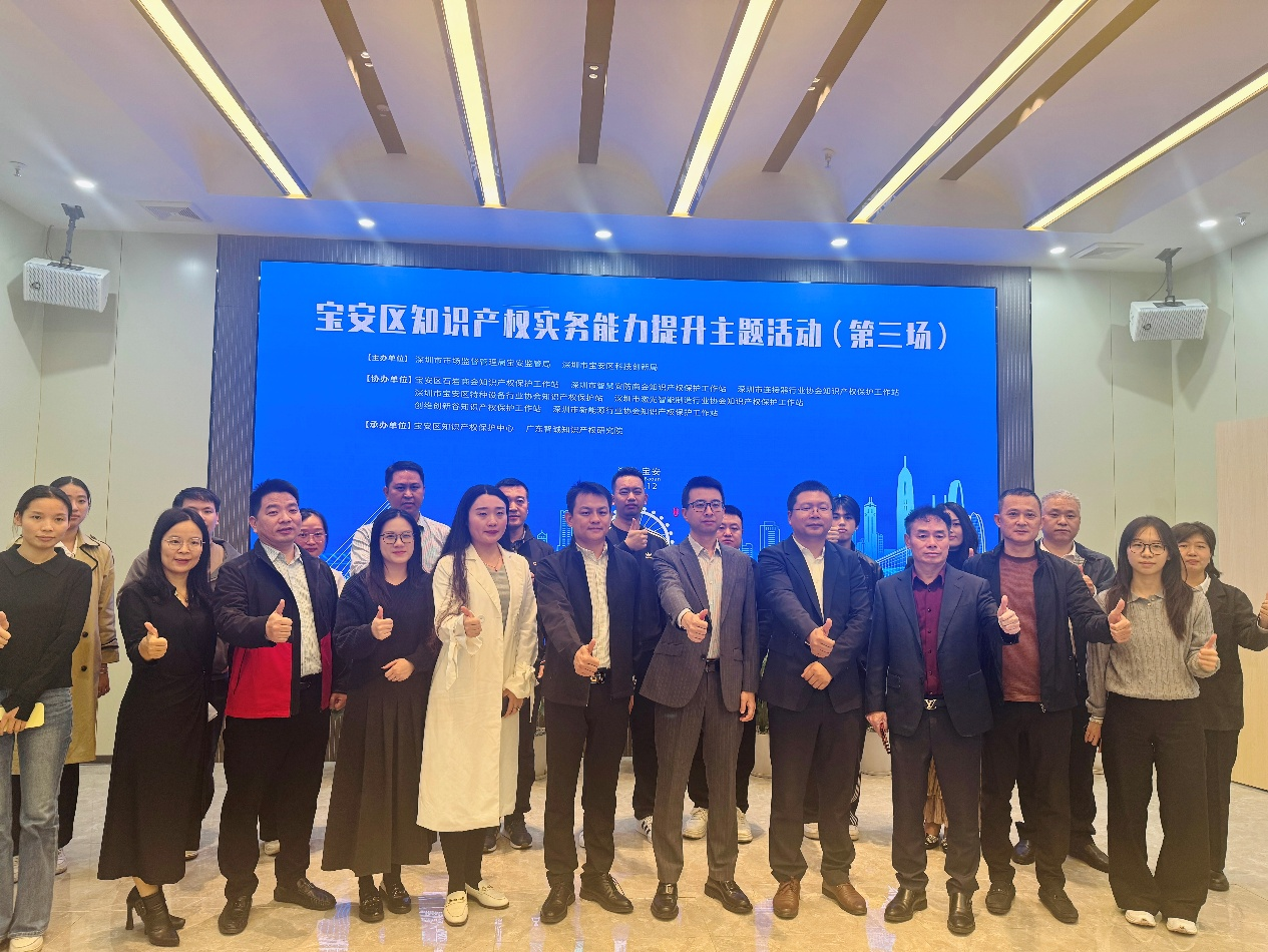 深圳·宝安,2025年12月4日 —— 为深入贯彻知识产权强国战略,落实宝安区“1+10+N”知识产权保护体系建设要求,由深圳市市场监督管理局宝安监管局、深圳市宝安区科技创新局联合主办,宝安区知识产权保护中心、广东智诚知识产权研究院承办的**“宝安区知识产权实务能力提升主题活动(第三场)”**于12月4日下午在宝安区石岩街道海谷科技大厦T5A二楼圆满举行。活动汇聚政府部门、行业协会、企业及专业服务机构代表,聚焦知识产权侵权识别、商标布局与金融保险赋能,助力企业构建全链条保护体系,现场气氛热烈、成效显著。